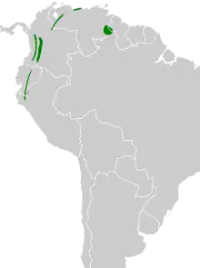 It is found in Colombia, Ecuador, Guyana, Peru, and Venezuela. Its natural habitat is subtropical or tropical moist montane forests. Its preferences include relatively dense second-growth forests and stands of bamboo, so it is threatened by deforestation in the Andes.[3] Nests of this species often rely on bamboo twigs.[4]