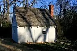 On average, slave quarters were log cabins with dirt floors, clay chimneys, wood-shingle roofs, and one unglazed window.[9][3] Windows lacking glass would have been covered with shutters or curtains. Slave houses built in the 19th century were more likely to have plank floors and be raised on piers.[2] Typical 19th-century quarters were around 200 square feet in area.[2] Some slave dwellings in the United States were wood-frame or masonry buildings; slave quarters at two sites in South Carolina were found to have African-styled, clay-walled, wattle-and-daub construction that was common in the Caribbean slave housing but extremely rare in North America.[12] Brick was an uncommon building material, but some slave quarters were constructed from field stone;[3] for example, local limestone was used in Maryland.[11] Contemporary documentarians report that former slave houses often have low ceilings, little natural light, and feel "stuffy".[13] The home of the slave owner on the plantation or farm was typically called the big house.[5] Slave quarters were usually located near the big house but subsidiary in size and quality of construction, and subject to surveillance, inspection and regulation. In some cases the slave owner lived off-site but an overseer's house was built near the slave quarters.[9]