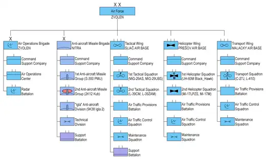 The Slovak Air Force, known since 2002 as the Air Force of the Armed Forces of the Slovak Republic (Slovak: Vzdušné sily Ozbrojených síl Slovenskej republiky), is the aviation and air defense branch of the Slovak Armed Forces. Operating 15 aircraft and 18 helicopters from three air bases : MalackyKuchyňa, Sliač, Prešov. It succeeded the Czechoslovak Air Force together with the Czech Air Force in 1993. The Slovak Air Force is part of NATO Integrated Air Defense System – NATINADS.[2][3][4][5][6]