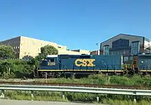 CSX ex-EMD GP40 road slug 2358 in Chester, Pennsylvania. It lacks radiator openings and fans, compared to the trailing unit.