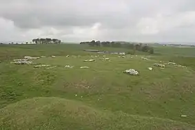 This is a stone circle henge in the far west of the parish within Middleton Common. It is a druidical circle, the stones forming the circle are from six to eight feet in length, and three to four feet in width, unhewn and of varied shapes. The original number of stones is unknown as many of them have been broken, but there potentially were from 30 to 35, all of which lie horizontally on the ground and are angled towards the centre. The circle is about 150 feet in diameter and is surrounded by a vallum and entrenchment with openings or entrances on the north and south sides.[21]