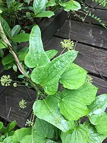 Smilax pseudochina is a climbing herbaceous vine which grows up to 2 meters (7 feet) tall, the thornless stems only live one year but will regrow the next. The stems have numerous tendrils which twist around objects and help the plant climb. The leaves are glabrous and triangular to oval (ovate) shaped and may almost be hastate at the base and range from 5–12 cm long to 2–5 cm wide. The leaf edges are often straight or almost concave, this helps distinguish it from other Smilax spp. which typically have convex edges on the leaves. The stem is sometimes unbranched but may have a few branches. The flowers are dioecious and greenish with 6 tepals. The flowers open in June and the berries mature in September. The berries are round, blue or black with a waxy coat and borne on long umbels axially from the upper leaves; these umbels contain from 10-35 flowers or fruits.[5][6]
