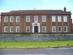 The north and south side façades follow the pattern of the west façade but in red and grey brickwork, with pilasters at each side and the panelled parapet. The north façade is five bays wide with twelve pane sash windows on each floor constructed from a galletted ragstone plinth. The south façade has a brick plinth and the windows here are less regular with blocked windows on the west side at both levels and smaller six pane windows. A projecting bay fills the centre of the façade. The rear façade is divided by a central wing projecting eastwards which turns to the south to form the north and east sides of a courtyard. The rear of the main block has a cornice and two six pane windows. The central wing and its returns have six pane windows on the south side and twelve pane windows on the north side.[5]