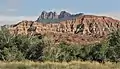 Smithsonian Butte is situated four miles (6.4 km) southwest of Rockville and four miles south of Zion National Park, and can be seen from Utah State Route 9. Topographic relief is significant as it rises 2,000-feet (610-meters) in one mile on its south side, and 3,000 feet in three miles above the Virgin River on its north aspect which drains precipitation runoff from this mountain. Its nearest higher neighbor is Zion Butte, 3.2 mi (5.1 km) to the southeast, and Eagle Crags are four miles to the east-northeast.[3] The uppermost part of this mountain is composed of light-colored Jurassic Navajo Sandstone which overlays the deep-red sandstone of the Kayenta Formation. This geographical feature was named by geologist Clarence Edward Dutton (1841–1912) for the Smithsonian Institution which had sponsored an exploration of the region, and the toponym was officially adopted in 1934 by the U.S. Board on Geographic Names.[2] From 1875 to 1877, Dutton's field party mapped 12,000 square miles (31,000 km2) of the high plateaus of southern Utah.[4] The saddle between Smithsonian Butte and its parent Caanan Mountain is named Dutton Pass, after him.[5] Access to this mountain is via the Smithsonian Butte National Back Country Byway.[6]