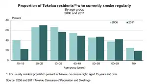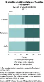 Smoking in Tokelau is prevalent, with ethnic Tokelauans having the highest smoking prevalence of all Pacific ethnicities.[1] In the 2011 Tokelau Census, 47.8% of people aged over 15 were found to be regular cigarette smokers.