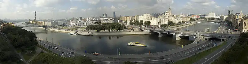 55°44.892′N 37°34.4712′E / 55.748200°N 37.5745200°E Smolensky Metro Bridge (Russian: Смоленский метромост, Metromost) is a steel arch bridge that spans Moskva River in Dorogomilovo District of Moscow, Russia. It is the first bridge built for the Moscow Metro in 1935–1937, designed by N.P.Polikarpov, P.K.Antonov (structural engineering) and Yakovlev brothers (architectural design). It is one of two (the second one is Mitinsky Metro Bridge) bridges over Moskva River that are used exclusively by Metro (subway) trains, while the other Metro bridges combine road and rail.