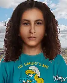 The decedent was determined to be a teenaged female between the ages of 15 and 17 years old.[4] The decedent was likely mixed race, most likely African American and Caucasian.[2] She had long curly dark brown hair, held back from her face with a standard bobby pin.[2] Examination suggested that the decedent had hair dye in her hair at some point.[5] The decedent was found fully clothed. She wore size 5 cargo pants,[2] and a distinctive blue-green shirt bearing an image of the cartoon character Smurfette, with text reading "HE SMURFS ME/HE SMURFS ME NOT".[3] However, the decedent was also found wearing adult women's lingerie,[5] consisting of pink underpants and a black bra.[4] The presence of these items despite her age and childish outfit has led investigators to suspect the victim was involved in sex trafficking.[5] Additionally, the area where the decedent was found was known as a hub for brothels.[5] A common contributing factor which makes girls vulnerable to sex trafficking is estrangement, which may be the reason why the victim has not been identified.[5]