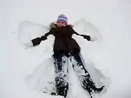 A snow angel is a design, made in fresh snow, by lying on one's back and moving one's arms up and down, and one's legs from side to side, to form the shape of an angel.