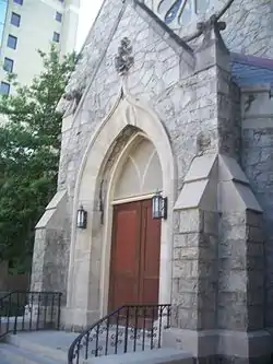 Snyder Memorial Church was constructed in a Gothic Revival architecture style for $31,000. It is made of granite and Indiana limestone. It includes a crenelated bell tower and an intricate rose window overlooking Hemming Park.[5] The church is owned by the City of Jacksonville.[5][6]