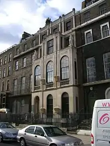 In 1804, he remodelled Ramsey Abbey (none of his work there now survives);[93] the remodelling of the south front of Port Eliot and new interiors (1804–06); the Gothic Library at Stowe House (1805–06); Moggerhanger House (1791–1809); for Marden Hill, Hertfordshire, Soane designed a new porch and entrance hall (1818);[94] the remodelling of Wotton House after damage by fire (1820); a terrace of six houses above shops in Regent Street London (1820–21), demolished;[95] and Pell Wall Hall (1822). Among Soane's most notable works are the dining rooms of both Numbers 10 and 11 Downing Street[96] (1824–26) for the Prime Minister and Chancellor of the Exchequer respectively of Great Britain.