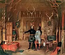 In June 1829 the elder brother had shown a manuscript, containing tartan patterns and dated in 1721, to Sir Thomas Dick-Lauder who was much impressed by it, but Sir Walter Scott warned Dick-Lauder that the brothers 'are men of warm imaginations ... of much accomplishment but little probity – that is, in antiquarian matters'.[27] Sir Walter Scott, who died in 1832, had rejected the entire notion of clan tartans, saying that the 'idea of distinguishing the clans by their tartans is but a fashion of modern date'. On behalf of the Society of Scottish Antiquaries he was shown a transcript of part of the brothers' manuscript but from its language alone 'indignantly declared his conviction that the MS itself must be an absolute fabrication'.[28] Scott remembered seeing one of the brothers wearing the badge of High Constable of Scotland (as the Earls of Erroll were), 'which he could have no more right to wear than the Crown'.[29] Dick-Lauder was himself an author of historical romances and had put up a monument to the Lauder family in Edinburgh showing a quite spurious descent, but one 'as he wished it to be'.[30]