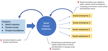 - Social finance institutions: Social finance institutions act as financial intermediaries by linking the supply and demand of capital. They are responsible for raising funds from the investors of group 1, pooling these funds and redistributing them to the social enterprises of group 2.[11] Social enterprises are ranked by profitability and preference is given to organisations with strong track records of effective social service.[20]