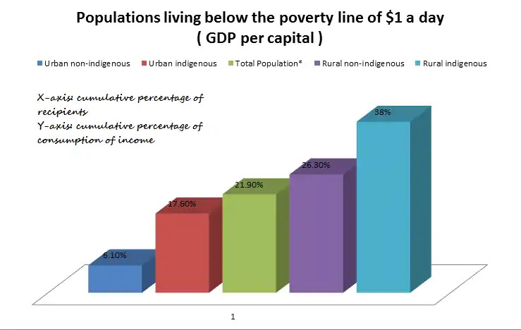 Furthermore, the 38 percent poverty rate experienced by the rural indigenous population is almost twice the national average of 21.9 percent and at least 20 percent greater than their urban contemporaries, highlighting a rural-urban divide in terms of development.[11]