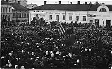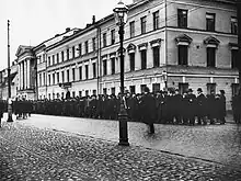 In 1905, following the defeat of the Russian Empire in the Russo-Japanese War and the Bloody Sunday event, the Tsardom was put into question. This revolutionary fervor had spread to Finland, following a strike of Valtionrautatiet (Finnish State Railways) workers in St. Petersburg, there was also annoyance and anger at Russian Authorities, due to the Russification of Finland.[4] In August, a large amount of Finnish Workers and High school students had demanded universal voting rights, this lead to worries in the Aristocracy and the Bourgeoisie, who began demanding the resignation of the Government, lead by the Old Finnish Party. The general strike began on 30 October in Helsinki's Senate Square and in Tampere's Keskustori by Workers, followed later by Students and Teekkari.[5] This lead to the total stop of Schooling, Factories, Shops and Offices. The strike movement later also expanded to other important locations, such as Viipuri and Oulu.