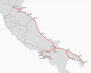 The Southern Railways was established in 1862 to build a railway from Ancona to Brindisi. Although this was originally a Rothchild's promotion, it was founded as an Italian company led by Count Pietro Bastogi of Livorno. By 1865 it completed its line to Brindisi and it opened a branch from Bari to Taranto in 1868.[1] In the reorganisation of Italian railway concessions on 1 July 1865, it acquired the line from Bologna to Ancona and the branch from Castel Bolognese to Ravenna from the General Roman Railway Company.[2]