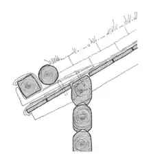 Erosion at the verges was in some districts prevented by means of similar logs, sometimes joined crosswise at the gable top. More common was a row of rocks gathered from the fields.[4] Verge boards were not a feature of ancient log buildings with sod roofs, but were introduced during the 17th and 18th centuries through influence from urban architecture with tile roofs.[13]