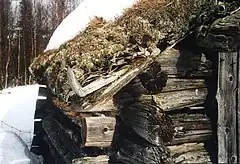 A sod roof, or turf roof, is a traditional Scandinavian type of green roof covered with sod on top of several layers of birch bark on gently sloping wooden roof boards. Until the late 19th century, it was the most common roof on rural log houses in Norway and large parts of the rest of Scandinavia. Its distribution roughly corresponds to the distribution of the log building technique in the vernacular architecture of Finland and the Scandinavian peninsula. The load of approximately 250 kg per m2 of a sod roof is an advantage because it helps to compress the logs and make the walls more draught-proof. In winter the total load may well increase to 400 or 500 kg per m2 because of snow.[1] Sod is also a reasonably efficient insulator in a cold climate. The birch bark underneath ensures that the roof will be waterproof.