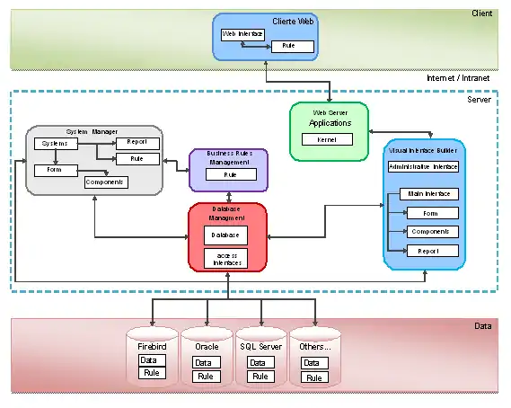 The picture below illustrates some details from Webrun internal architecture and a default execution environment of an application built by Softwell Maker, where business rules can run into three layers: client (JavaScript), server (Java/.NET), and database (Oracle, MS-SQL Server, PostgreSQL, …). We can also realize internals subsystems of Visual Interface Builder (HTML, JavaScript, CSS, PDF, ...), Database Management (Transactions, Procedures, Sequences, …), and System Manager (User’s session, authentication, permissions, …).