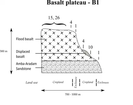 The reduced soil protection by vegetation cover, combined with steep slopes and erosive rainfall has led to excessive soil erosion.[5][10][11] Nutrients and organic matter were lost and soil depth was reduced. Hence, soil erosion is an important problem, which results in low crop yields and biomass production. As a response to the strong degradation and thanks to the hard labour of many people in the villages, soil conservation has been carried out on a large scale since the 1980s and especially 1980s; this has curbed rates of soil loss.[12][13] Measures include the construction of infiltration trenches, stone bunds,[14] check dams,[15] small reservoirs such as Addi Asme'e as well as a major biological measure: exclosures in order to allow forest regeneration.[16]
