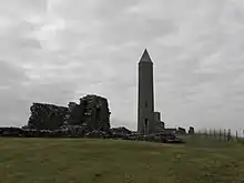 Several art historians have tried to piece together the person identified by the damaged "...nlan" lettering, and it is generally assumed to be part of the name "Scannlain". Ó Floinn suggests Coencomrach Ua Scannlain (d. 1011) as a potential candidate.[38][39] Ua Scannlain was a cleric at Devenish, but although he fits the location and period, his full name is too long for the gap in the lettering and it is very unlikely he would have been mentioned by surname only.[40] Other potential clerics are Scannlain Ua Dungalaín, abbot of Downpatrick, who was "abducted and blinded in 1010", and Scanlan Mac Cathail, ri Eoganacht of Lough Leane, although neither are considered strong candidates by most art historians.[40]