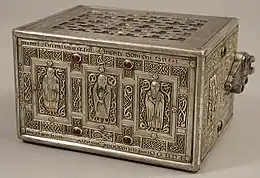 Two of the panels around the sides are lost. The two remaining side-panels contain interlace, and signatures and other Latin inscriptions around their borders.[6] Both of the short (or end) sides have triangular bronze mounts that would have functioned as clasps so that the shrine could be carried.[3][24] Both have half-length decorative panels to hold inserts of ecclesiasticals. One is lost but the one that remains contains a figure, generally assumed to be St. Molaisse, in full profile wearing a tunic or habit.[15] He has rounded facial features, a disproportionally large head,[25] and a forked beard. He holds a book, probably his Gospel, to his chest with one hand and a pastoral staff, a flail or a sprinkler for holy water with the other.[6][26] His outer vestment, or chasuble, was originally embroidered by palm-leaf designs, while the collar is cut in sharply pointed V-shapes.[lower-alpha 2][28]