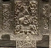 Mac Flaithbertach had two obituaries in 1025, but like nearly all 11th-century craftsmen, nothing is known of Gilla Baíthín.[33] Analysis of the style and technique of the 11th-century phase indicate a single hand created the figurative panels on the front and sides, the filigree, the zoomorphic panels and the strap-hinge.[10] The art historian Mitchell Perette describes Baíthín's script as "remarkably uneven".[35] The first-name Gilla is also inscribed on later 11th- and 12th-century Irish high crosses and churches, indicating that it was a name "taken for Christian life", and that Baíthín was a cleric.[36] The art historian Patrick Wallace notes that the naming of a craftsman in such an early work indicates the esteem Insular craftsmen must have enjoyed in contemporary Irish society, noting how mainland European artists did not begin to sign their works until the Renaissance. He goes on to write that the signature may be "one of the earliest instances anywhere of a culture which made such acknowledgement[s]."[37]