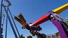 Sol Spin is a swinging Top Scan ride at Knott's Berry Farm built by Mondial Rides. Riders spins in a circular rotation while swinging in an angle. The ride opened to the general public on April 21, 2017 in the Fiesta Village section of the park.[1] Designed by Mondial, Sol Spin is a tipsy top turvy adventure taking places 6 stories high over Fiesta Village. As the ride lifts off the ground, riders begin spinning in a circular motion while guests are spun around. At its peak, Sol Spin rotates guests in circular motion at 60 feet in the air. Riders can experience up to 4gs at the peak of the ride. In addition, the ride is located on the former spot of Windseeker which was also built by Mondial. Sol Spin is unique as it is the largest Mondial Top Scan to this day. Knott's Sol Spin was customized to fit in the former location of Windseeker.[2]