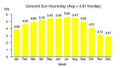 Solar power in New Hampshire provides a small percentage of the state's electricity. State renewable requirements and declining prices have led to some installations. Photovoltaics on rooftops can provide 53.4% of all electricity used in New Hampshire, from 5,300 MW of solar panels, and 72% of the electricity used in Concord, New Hampshire.[2] A 2016 estimate suggests that a typical 5 kW system costing $25,000 before credits and utility savings will pay for itself in 9 years, and generate a profit of $34,196 over the rest of its 25-year life. A loan or lease provides a net savings each year, including the first year.[3] New Hampshire has a rebate program which pays $0.75/W for residential systems up to 5 kW, for up to 50% of the system cost, up to $3,750.[4] However, New Hampshire's solar installation lagged behind nearby states such as Vermont and New York, which in 2013 had 10 times and 25 times more solar, respectively.