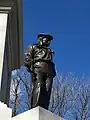 Bronze statues stand on the corners of the monument to represent peace, holding an olive branch and facing south; history, holding a book and gazing skyward; a sailor, clad in a navy uniform and gazing toward the sea; and the citizen-soldier, wearing an army uniform and standing at ease. The bases that hold the statues were empty for several years leading to conflicting stories that the monument was never finished or the statues had been stolen or placed in storage.[2][3] The mystery was solved in 2014 when the statues were returned after restoration at the Daedalus Studios in nearby Watertown.[4]