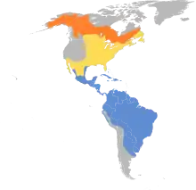 It breeds in woodlands across Alaska and Canada. It is a migratory bird, wintering in Central and South America, especially in the Amazon River basin, and the Caribbean. It is a very rare vagrant to western Europe, and goes there in the summer–autumn period.