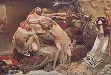 Solomon's painting was grounded in his influence from his teacher Alexandre Cabanel, but was also influenced by Frederic Leighton and Lawrence Alma-Tadema. Solomon painted mainly portraits to earn a living, but also painted dramatic, theatrical scenes from mythology and the bible on large canvasses. These scenes include some of his more popular paintings. In 1897 he painted a mural for the Royal Exchange, London Charles I demanding the Five Members at the Guildhall, 1641–42. One of Solomon's most popular works was Samson (1887), depicting a scene from the biblical story of Samson and Delilah.[1] This painting was praised for its use of multiple male nudes in active poses.[4] Samson is one of few Solomon paintings on regular display, at the Walker Art Gallery in Liverpool.[1] Some other Solomon paintings that have received significant attention include Ajax and Cassandra (1886) and The Birth of Love (1896).[1]