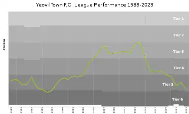 However, Since the turn of the century, Yeovil and Bath moved in opposite directions across the English football pyramid, with the two clubs being as many as five divisions apart from one another during the 2013–14 season. Having been promoted to the EFL Championship in 2013, Yeovil played second-tier football for the first time in their history during the 2013–14 season, at the same time, Bath were struggling in the sixth tier. Whilst the club were having one of the best periods in their history, Bath City were having one their worst, thus, local animosity between Bath and Yeovil dissipated. Albeit, Yeovil Town's decline since 2014 means that as of the 2022–23 season Bath City currently sit just one tier below.[9]