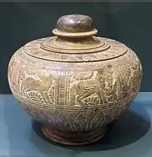 The reliquary of Stupa No.2 presents has inscriptions in Brahmi mentioning the names of Buddhist monks also appearing in the reliquary of Sanchi Stupa No.2 and Andher Stupas: Kasapagota, Majjhima, Kosikiputa, Gotiputa, and Apagira.[3] It would seem, then, that the ashes of these monks were divided between these three stupas.