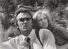 In 1975, Locke was cast in the revisionist antiwestern The Outlaw Josey Wales as the love interest of Clint Eastwood's eponymous character.[104] Locke said she chose the role for its exposure, following a run of unremarkable credits.[105][106] She took a pay cut just to be in the film; her salary for Josey Wales was $18,000, less than half of what she'd earned for her previous job.[107] The film emerged as one of the top 15 grossing films of 1976 and revived Locke's career.[108][109][110] She followed it up with a lead role alongside Eastwood in the popular action road film The Gauntlet (1977), the duo replacing Steve McQueen and Barbra Streisand, who bowed out from the production owing to a reported clash of egos.[111] Its pre-publicity touted Locke as "the first actress ever to be in a Clint Eastwood movie and get equal billing on screen with the macho star."[112] Eastwood predicted that she would win an Oscar for her performance.[113] Locke wasn't even nominated and received mixed critical response at best: on the upside, Vincent Canby of The New York Times said "Locke is not only pretty, but also occasionally genuinely funny"[114] and Los Angeles Times critic Kevin Thomas stated that Locke "has not received such a rich opportunity since her Academy Award-nominated debut";[115] in contrast, Gene Siskel of the Chicago Tribune said "she's wasted here"[116] and TV Guide felt that "Locke is simply repulsive."[117]