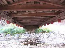 The bridge deck is made of wide boards laid perpendicular to the axis of the bridge, with two runners on top of the deck which run the length of the bridge.[5][17] The Burr arches which support the bridge are cruder than those in the other two Sullivan County covered bridges; they are not smooth "continuous arcs, but several straight segments joined at an angle".[3][5] The top of the Burr arch on the south (downstream) side of the bridge is noticeably lower than the top of the arch on the north (upstream) side.[23]