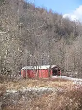 The covered bridge was built to provide access to a gristmill,[17] and the 1915 state highway map of Sullivan County shows a mill just downstream of the bridge on the east bank of Muncy Creek.[28] The 1941 map (using data from 1939) no longer shows a water-powered mill there, although it does show two buildings on the east bank of the creek, with one just upstream and one just downstream of the bridge.[29] Both of these buildings had disappeared by 1999.[30] The NRHP form states that the bridge had been recently repaired in 1969, and that additional maintenance work was needed. The repairs done at that time included replacing some of the siding panels, reinforcing the abutments with concrete, and "very minor addition of steel to the truss structure".[3]