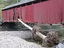 According to 2012 NBI data, the covered bridge was restored in 2001.[2] In September 2004, flooding from Hurricane Ivan followed by heavy rains in April 2005 made a hole in one of the covered bridge's abutments and weakened a structural support. Repair work took six weeks and was done by mid-August 2005.[33] August of that same year saw placement of riprap and fill in the creek to further protect the abutments, with the work done by Rexer's Drilling and Concrete of Dushore for $9,250. Erosion in September 2004 had destroyed a house 200 feet (61 m) upstream of the bridge, so the Sullivan County Commissioners planned additional work to stabilize the creek bed and prevent further erosion damage. The work, on private property and requiring permission from the Pennsylvania Department of Environmental Protection,[36] was done in the summer of 2006.[37]