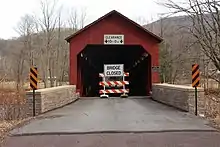The following table is a comparison of published measurements of length, width and load recorded in different sources using different methods, as well as the name or names cited. The NBI measures bridge length between the "backwalls of abutments" or the pavement grooves at the opposite ends of the bridge.[2] It defines the roadway width as "the most restrictive minimum distance between curbs or rails".[2] The NRHP form was prepared by the Pennsylvania Historical and Museum Commission (PHMC), which surveyed county engineers, historical and covered bridge societies, and others for all the covered bridges in the commonwealth.[3][13] The Evans visited every covered bridge in Pennsylvania in 2001 and measured each bridge's length (portal to portal) and width (at the portal) for their book.[14] The data in Zacher's book was based on a 1991 survey of all covered bridges in Pennsylvania by the PHMC and the Pennsylvania Department of Transportation, aided by local government and private agencies.[17] The article uses primarily the NBI and NRHP data, as they are national programs.