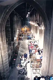The programme staged its largest event at the Millennium Stadium in Cardiff on the first Sunday of 2000.[17] A live audience of over 60,000 people came to sing hymns, with a 6,000 piece choir, an orchestra of 100 harps, the band of the Welsh Guards and an anthem specially written by Lord Andrew Lloyd Webber. The programme was produced by John Forrest. Ian Bradley said the event had a "wonderful vulgarity" but that it also had an "infectious sense of community"[17]
