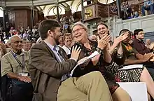 Following the Charlie Hebdo shooting, Eggerickx, in her role as president of the IHEU, worked to promote a campaign against blasphemy laws in which the IHEU and the European Humanist Federation aim to support organisations involved in the defence of free speech, against persecution in countries with religious minorities and those working against punitive blasphemy laws.[9] She has also spoken out against the treatment of prisoners of conscience as a result of blasphemy laws such as Raif Badawi and Asif Mohiuddin, calling Badawi's treatment "sickening" and a "gratuitous, violent sentence,"[9][10] and suggested laws which prevent criticism of religious institutions "is one reason why sexual abuse in the Catholic Church persisted so long."[11]