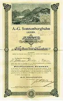 Share of the AG Sonnenbergbahn, issued 8. August 1901