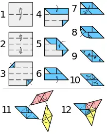 - Joining four modules together (instead of three), forming a flattened square pyramid that can become part of a quilt or a larger polyhedral face, e.g. in 12 and 24 modules large cubes. Such a square lacks structural integrity because without the diagonal folds the flaps are not restrained to stay in the far corner of the pockets.