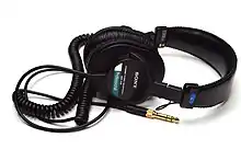 Sony MDR-V6 is a large diaphragm folding pair of headphones, the initial entry in Sony's Studio Monitor headphones, one of the most popular model lines among professional audio engineers. The product line was augmented by the MDR-V600, the MDR-7506 and then the MDR-7509 and MDR-7509HD models, which continue to be popular for audio editing, live sound and broadcast applications. The four models use a closed, circumaural sealed-ear design with a coiled oxygen-free copper cord, tipped with a combination ¼″ (6.35 mm) and ⅛″ mini (3.5 mm) TRS phone connector. As a product line, the MDR-series Studio Monitor folding headphones have been noted as a "favorite of sound professionals because they're reasonably flat sounding, inexpensive, compact, and they can take a lot of punishment."[1] The MDR prefix is an initialism of the Micro Dynamic Receiver trademark.[2]