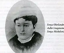 Sophia "Sonya" Adler (née Oberlander; c. 1862 – 1886), also known by her early stage name Sonya Michelson, was a Ukrainian actress who was one of the first women to perform in Yiddish theater in Imperial Russia. Later she became the first wife of actor Jacob Adler, with whom she relocated to London in 1883, after Yiddish theater was banned in Russia.