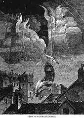 Blanchard had performed regularly at the Tivoli Gardens, making ascents twice a week when she was in Paris.[3] She had been warned repeatedly of the danger of using fireworks in her exhibitions. This display was to be a particularly impressive one with many more pyrotechnics than usual, and it appears that the warnings had made an impression on her. Some spectators implored her not to make the ascent, but others, eager to see the show, urged her on. One report suggested that she finally made up her mind and stepped into her chair with the words "Allons, ce sera pour la dernière fois" ("Let's go, this will be for the last time").[23]