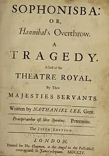 Sophonisba, or Hannibal's Overthrow is a 1675 tragedy by the English writer Nathaniel Lee.[1] It is based on the story of the Carthaginian noblewoman Sophonisba, one of numerous versions based on the story including John Marston's The Wonder of Women (1606) and James Thomson's Sophonisba (1730).