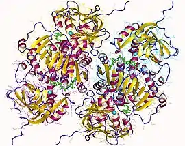 Sorbitol dehydrogenase is an enzyme in carbohydrate metabolism converting sorbitol, the sugar alcohol form of glucose, into fructose.[2] Together with aldose reductase, it provides a way for the body to produce fructose from glucose without using ATP. Sorbitol dehydrogenase uses NAD+ as a cofactor; its reaction is sorbitol + NAD+ --> fructose + NADH + H+. A zinc ion is also involved in catalysis. Organs that use it most frequently include the liver and seminal vesicle; it is found in various organisms from bacteria to humans. A secondary use is the metabolism of dietary sorbitol, though sorbitol is known not to be absorbed as well in the intestine as its related compounds glucose and fructose, and is usually found in quite small amounts in the diet (except when used as an artificial sweetener).