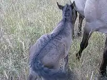 Sorraia are generally dun or a dun variation called grullo. Dun coloring includes primitive markings such as a black dorsal stripe, black tipped ears, horizontal striping on the legs and a dark muzzle area.[5] The dark muzzle area is in contrast to some other dun-colored horse breeds, who have light-colored muzzle areas and underbellies, possibly due to the presence of pangare genetics.[6] Sorraia horses have bi-colored manes and tails with lighter colored hairs that fringe the outside of the longer growing black hair.[4] This is a characteristic shared with other predominantly dun-colored breeds, such as the Fjord horse.[7] Purebred Sorraia occasionally have white markings, although they are rare and undesired by the breed's studbook.[4]