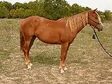 Sorrel is a reddish coat color in a horse lacking any black. It is a term that is usually synonymous with chestnut and one of the most common coat colors in horses. Some regions and breed registries distinguish it from chestnut, defining sorrel as a light, coppery shade, and chestnut as a browner shade. However, in terms of equine coat color genetics there is no known difference between sorrel and chestnut. Solid reddish-brown color is a base color of horses, caused by the recessive e gene.[1]