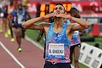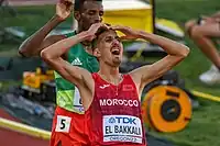 Soufiane El Bakkali (Arabic: سفيان البقالي; born 7 January 1996[5]) is a Moroccan male runner specializing in the 3000 metres steeplechase. He is the 2020 Tokyo Olympic champion, having previously finished fourth at the 2016 Rio Olympics. At the World Athletics Championships, El Bakkali won two gold medals, winning his first in 2022 and later in 2023, He won silver in 2017 and bronze in 2019. He also placed third at the 2019 African Games and second at the 2018 African Championships.